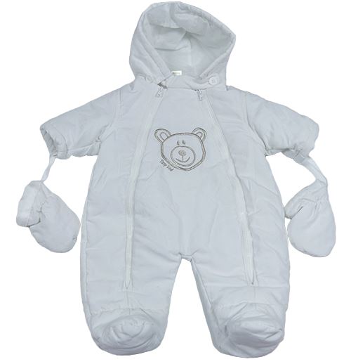 Biela šušťáková zimná kombinéza s medvedíkom a kapucí + rukavice