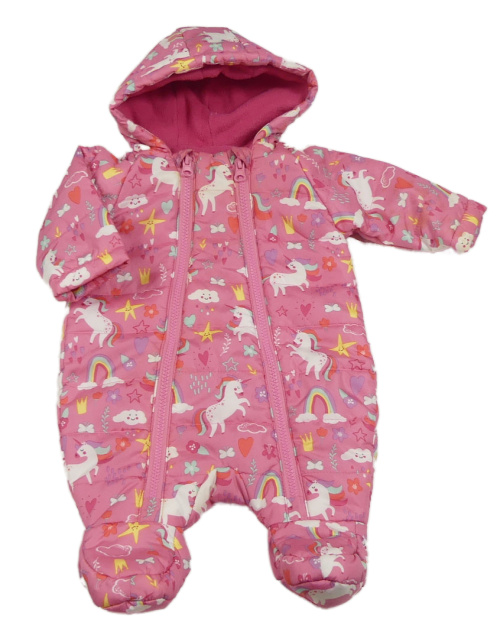• Ružová prešívaná šušťáková zimná kombinéza s jednorožcami a obrázkami a kapucňou St. Bernard