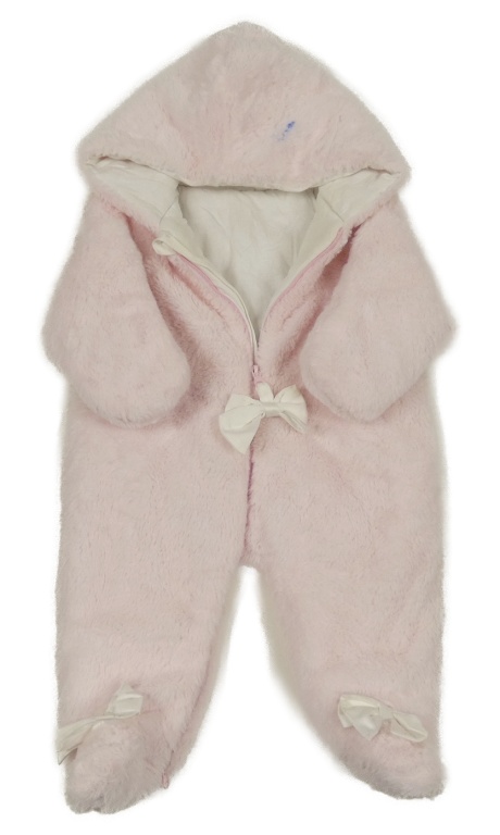 Svetloružová chlpatá zateplená kombinéza s mašľami a kapucňou