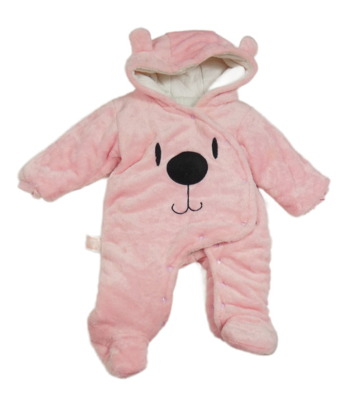 Ružová chlpatá zateplená kombinéza s medvěďom a kapucňou