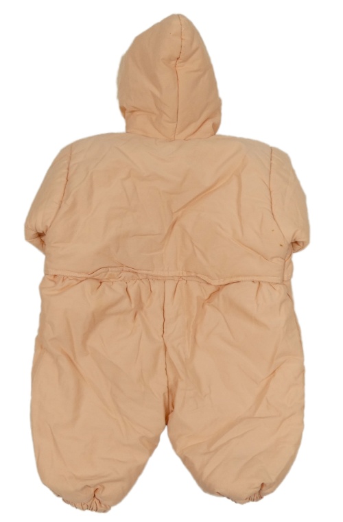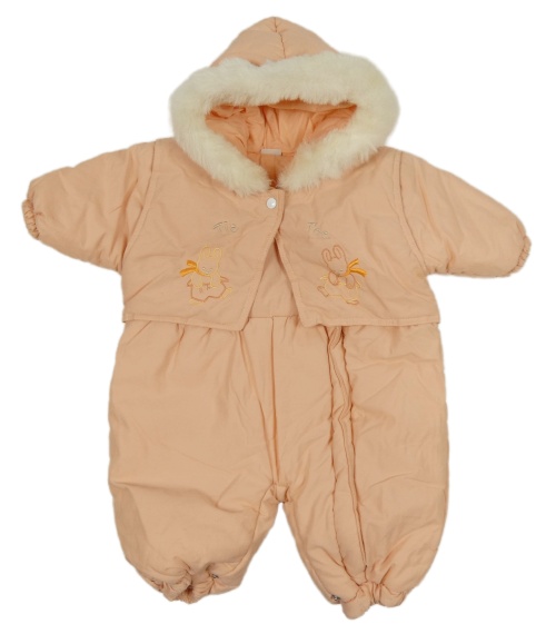 Svetloružová šušťáková zimná kombinéza s králíčky a kapucňou s kožešinou