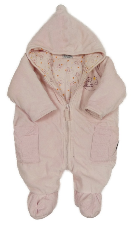 Svetloružová zamatová zateplená kombinéza s medvedíkom a kapucňou