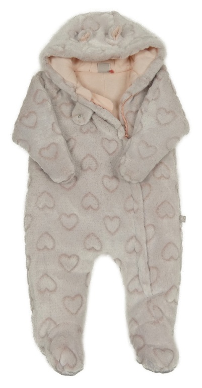 Bielo-staroružová chlpatá zateplená kombinéza so srdiečkami a kapucňou
