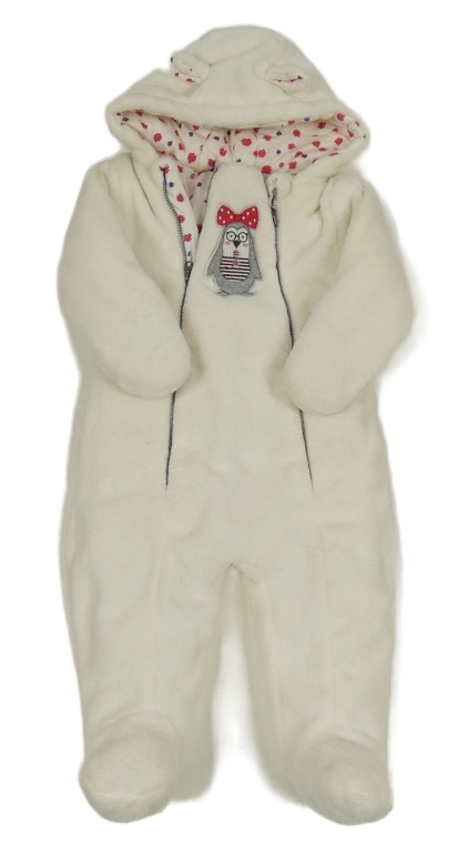 Smotanová kožušinová zateplená kombinéza s tučňákem a kapucňou