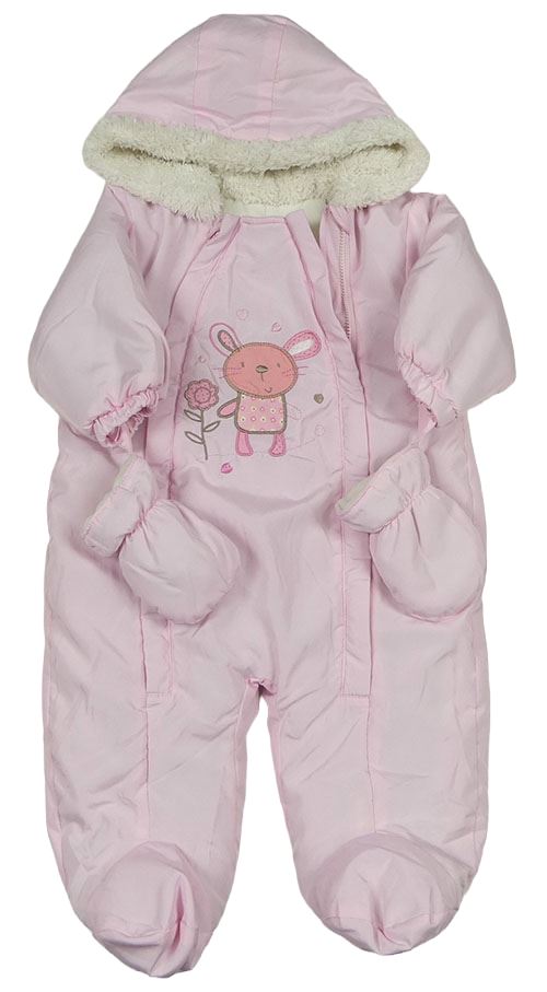 Svetloružová šušťáková zimná kombinéza so zajačikom a kapucňou s kožešinou + rukavice Matalan