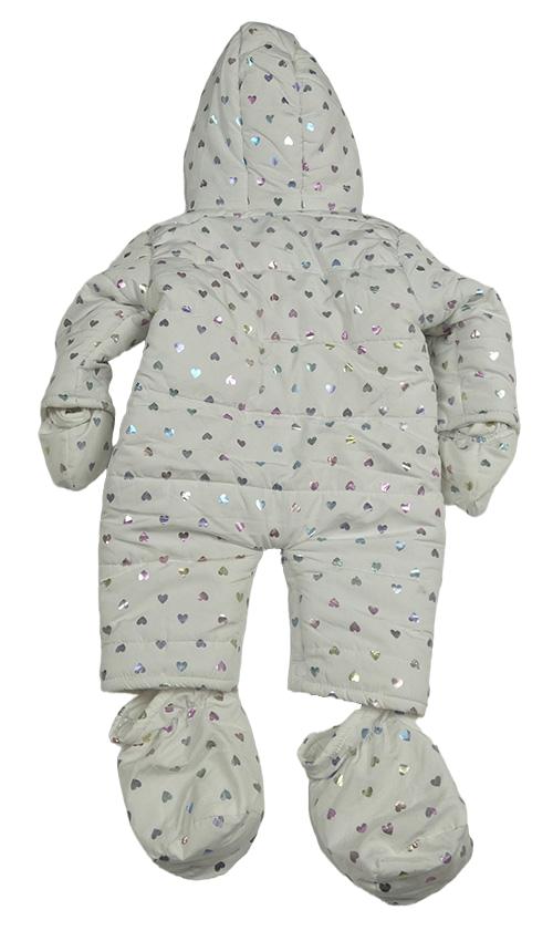 Biela prešívaná šušťáková zimná kombinéza s metalickými srdiečkami a kapucí + rukavice a cápačky CUTEY COUTURE
