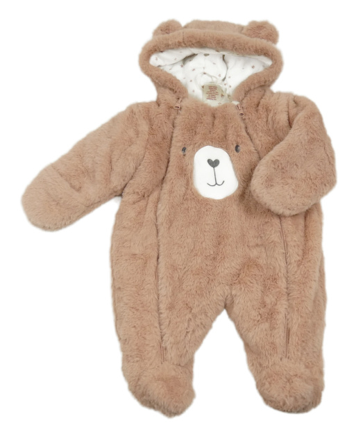 Svetloružová kožušinová zateplená kombinéza s medvěďom a kapucňou