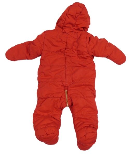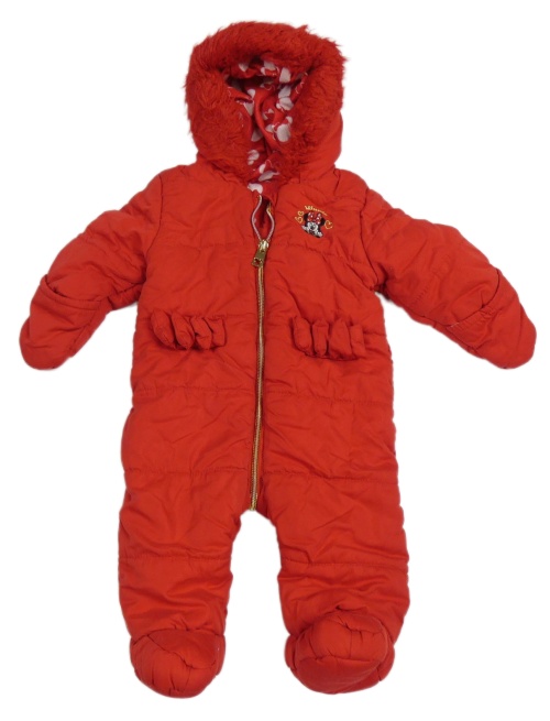 • Červená prešívaná šušťáková zimná kombinéza s Minnie a mašľami a kapucňou s kožešinou George