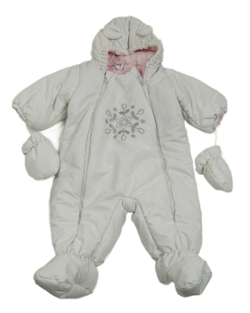 Biela šušťáková zimná kombinéza s výšivkou a kapucí + rukavice Ergee