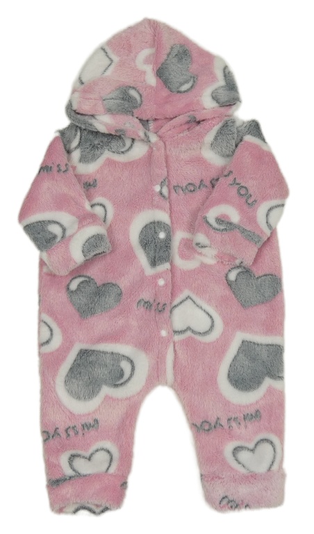 Ružovo-sivo-biela plyšová kombinéza so srdiečkami a kapucňou