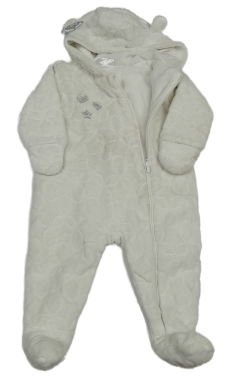 Biela vzorovaná plyšová podšitá kombinéza so striebornymi obrázky a kapucňou s uškami Ergee