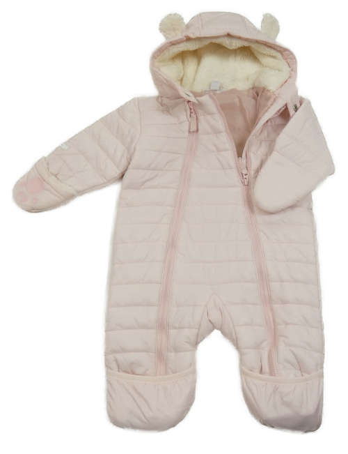 Svetloružová šušťáková prešívaná zimná kombinéza s kapucňou s uškami