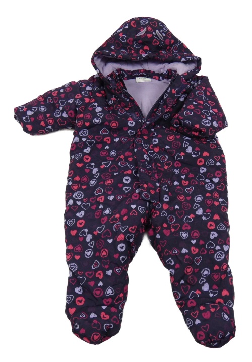 Fialovo-ružová vzorovaná šušťáková zimná kombinéza so srdiečkami a kapucňou