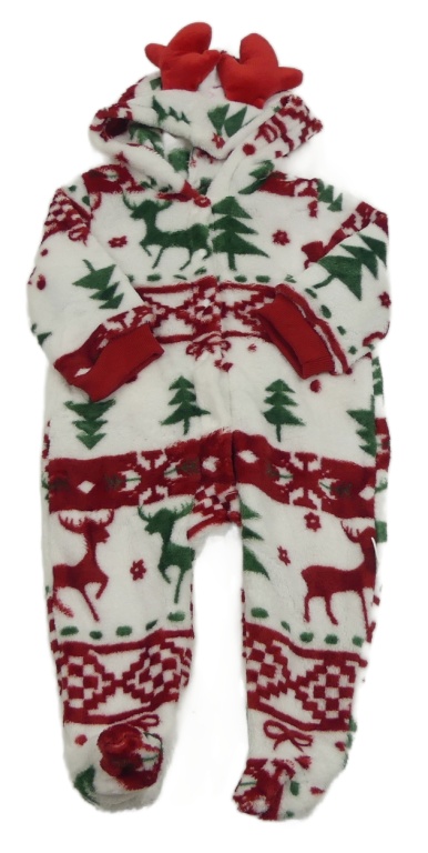 Bielo-červeno-zelená plyšová kombinéza so stromky a kapucňou