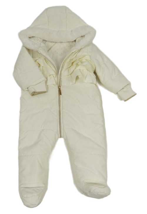 Smotanová šušťáková zimná kombinéza s volánikmi a kapucňou