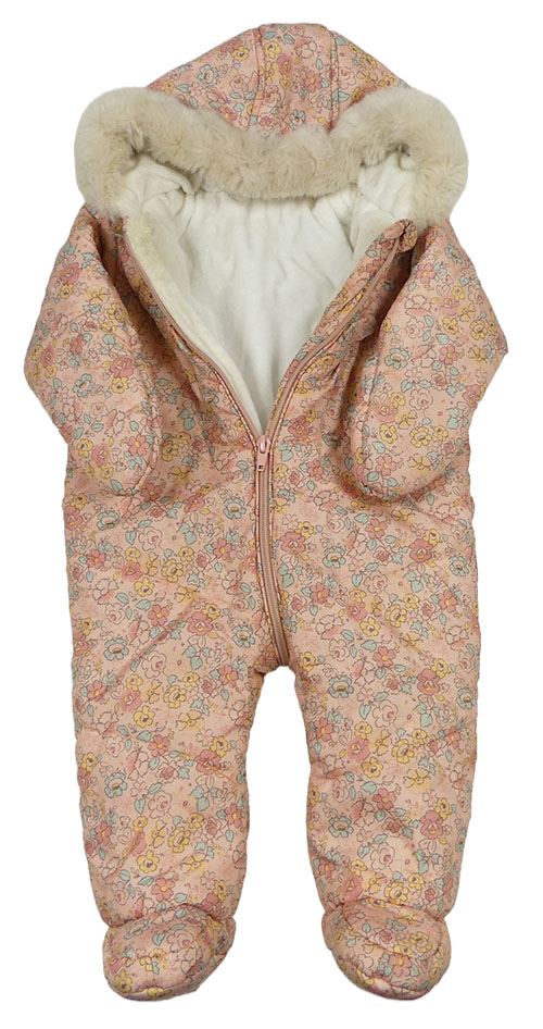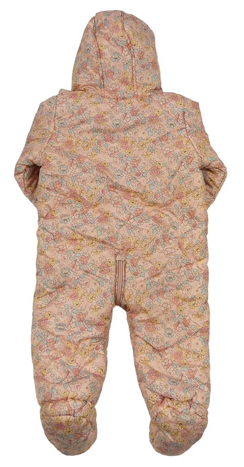 • Broskvová prešívaná šušťáková zimná kombinéza s kvietkami a volániky a kapucňou s kožešinou George