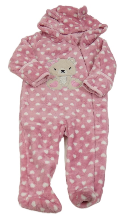 Ružová chlpatá kombinéza s medvědem, srdiečkami a kapucňou