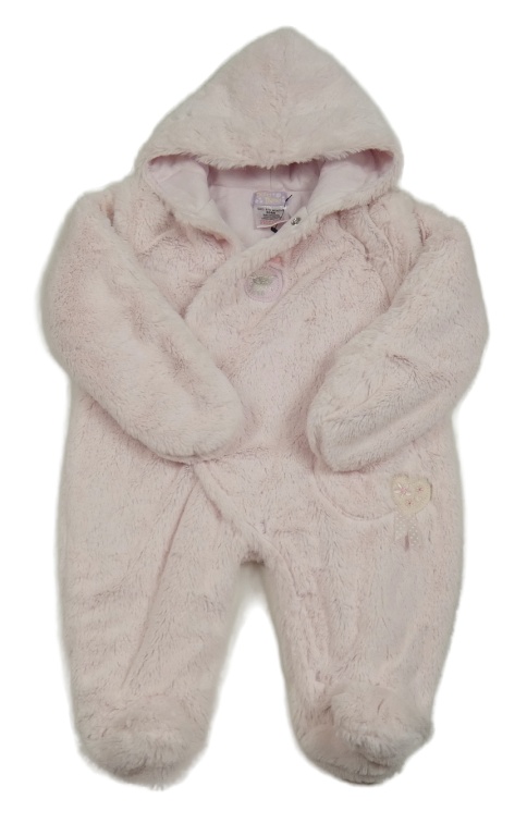 Svetloružová kožušinová podšitá kombinéza s nášivkami a kapucňou