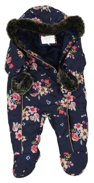 Tmavomodrá šušťáková zimná kombinéza s kvetmi a kapucňou a rukavicemi Mothercare