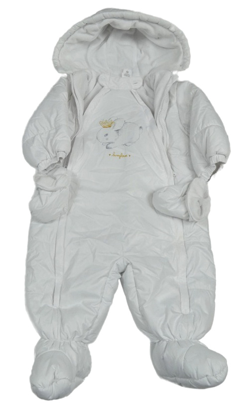 Biela šušťáková zimná kombinéza s králikom a kapucí + rukavice C&A