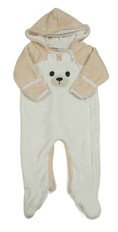 • Bielo-smotanová plyšová kombinéza s medvěďom a kapucňou
