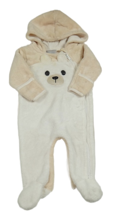 Béžovo-biela chlpatá kombinéza s medvedíkom a kapucňou Baby Mack