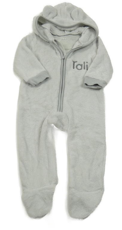 • Svetlosivá plyšová kombinéza s nápisom a kapucňou