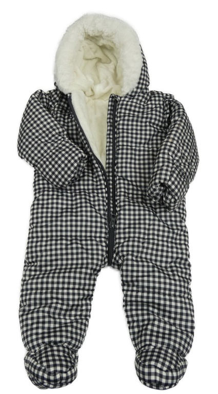 • Čierno-tmavošedo-biela kockovaná šušťáková zimná kombinéza s volániky a kapucňou s kožešinou George