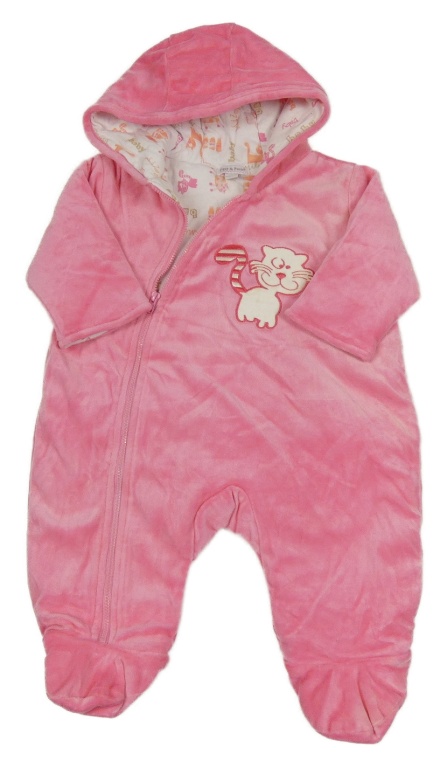 Ružová zamatová zateplená kombinéza s mačičkou a kapucňou