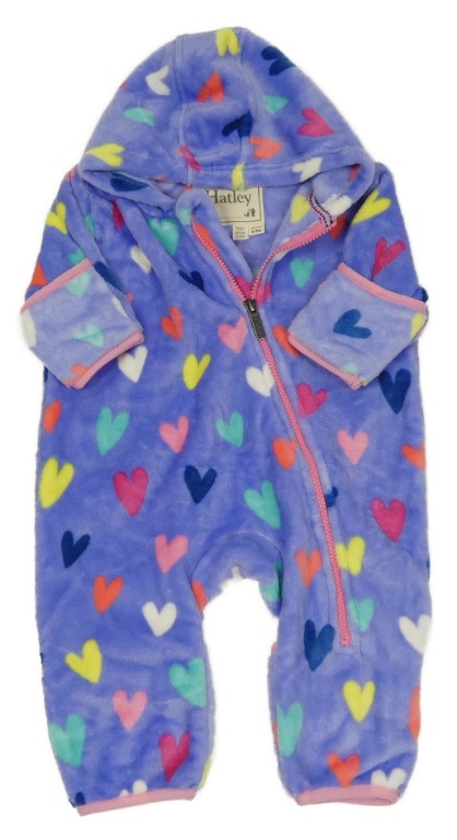 Fialová chlpatá kombinéza so srdiečkami a kapucňou Hatley