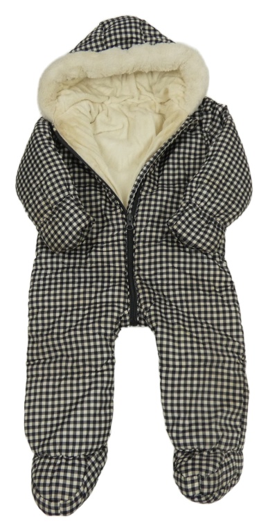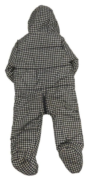 • Čierno-tmavošedo-smotanová kockovaná prešívaná šušťáková zimná kombinéza s volániky a kapucňou s kožešinou George
