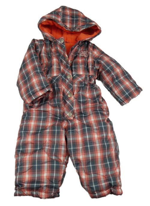 Sivo-červená kockovaná šušťáková zimná kombinéza s kapucňou