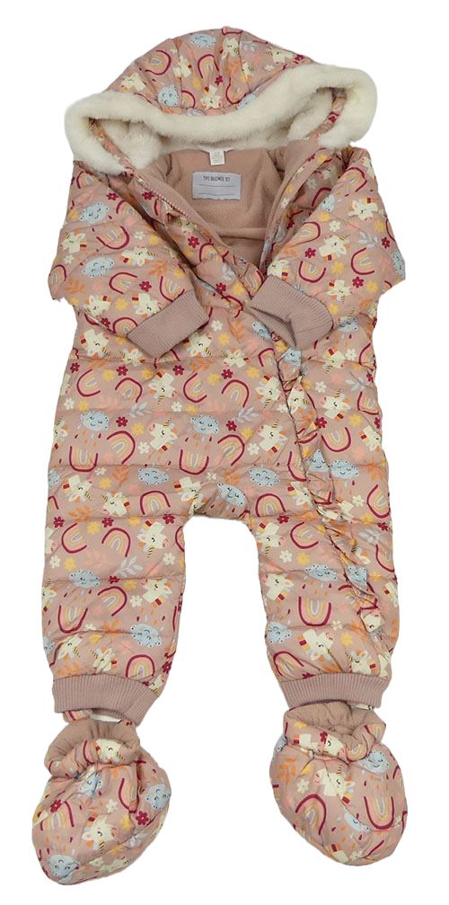 • Pudrová prešívaná šušťáková zimná kombinéza s jednorožci a duhami a kapucňou s kožušinovou + cápačky M&Co