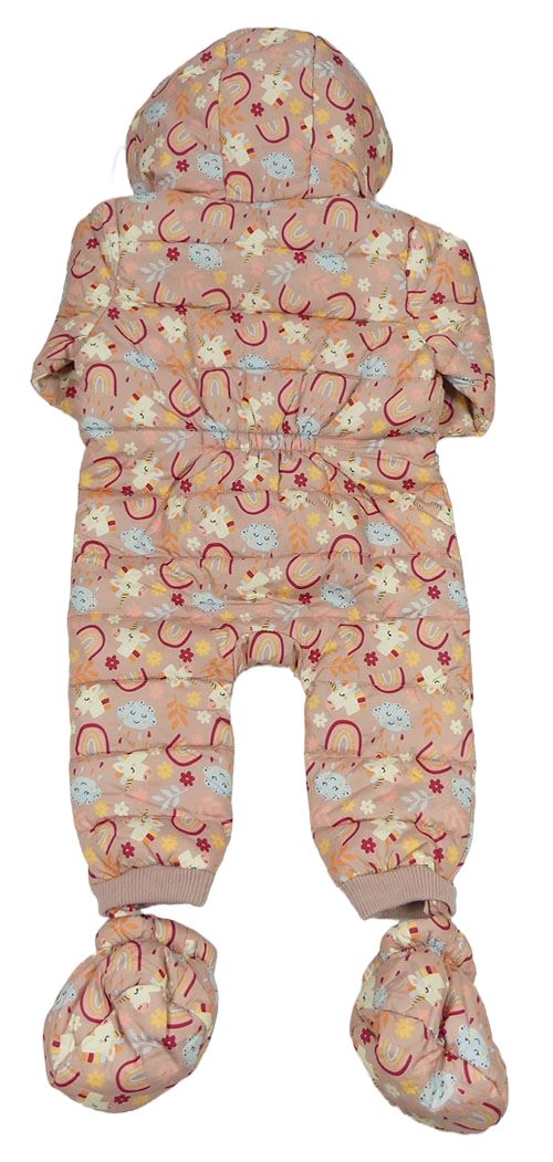 Pudrová prešívaná šušťáková zimná kombinéza s jednorožci a duhami a kapucňou s kožušinovou + cápačky M&Co