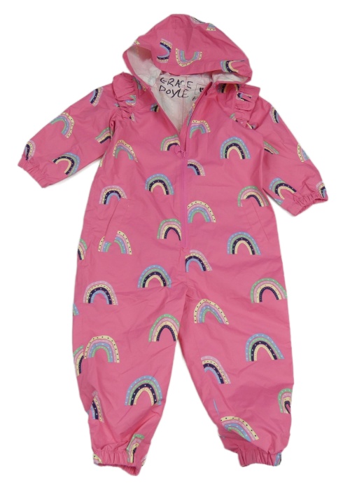 Ružová šušťáková nepromokavá kombinéza s duhami a kapucňou