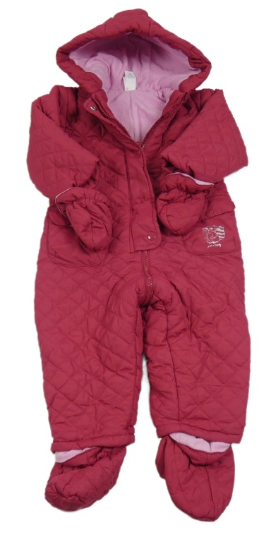 Malinová šušťáková prešívaná zateplená kombinéza s kapucí + rukavice + cápačky C&A