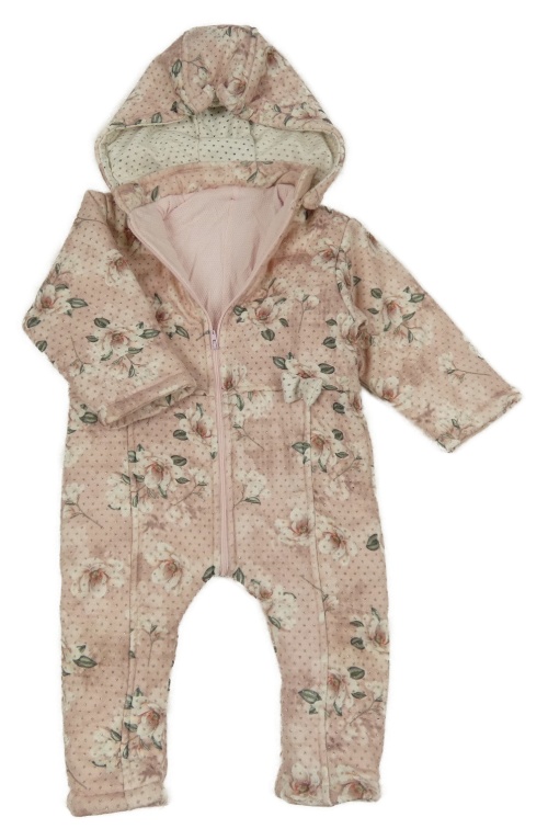 Ružová bodkovaná á trblietavá zateplená kombinéza s kvetmi a kapucňou