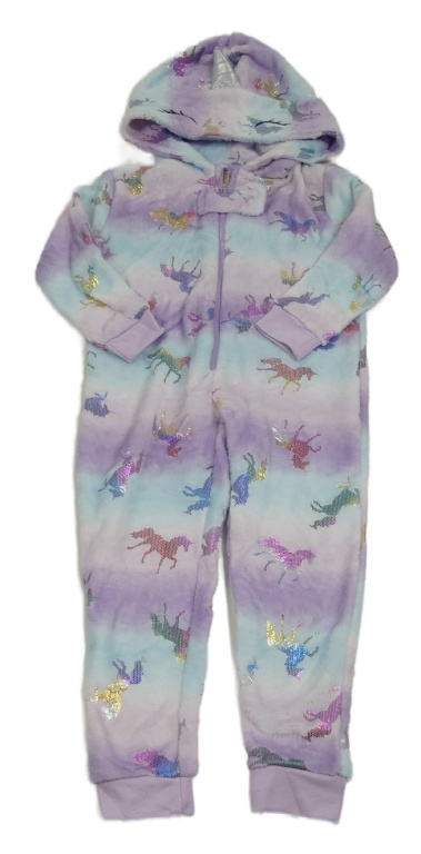 Lila-modrá pruhovaná chlpatá kombinéza s jednorožcami a kapucňou