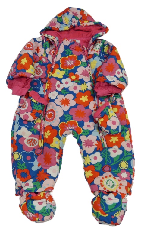 • Tmavomodro-ružovo-zelená kvetovaná šušťáková zimná kombinéza s kapucí + rukavice + topánky