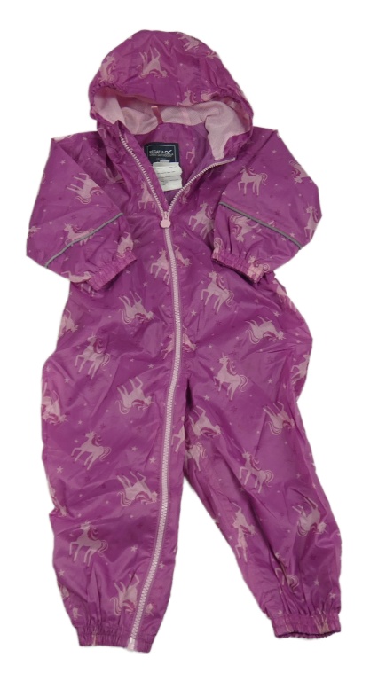 Fialová šušťáková podšitá funkčná kombinéza s jednorožcami a kapucňou Regatta