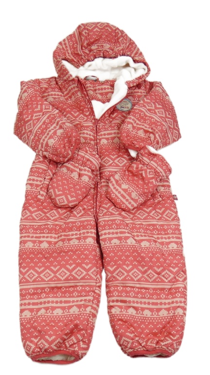 Ružovo-biela vzorovaná šušťáková zimná kombinéza s nášivkou a kapucí + rukavice Impidimpi
