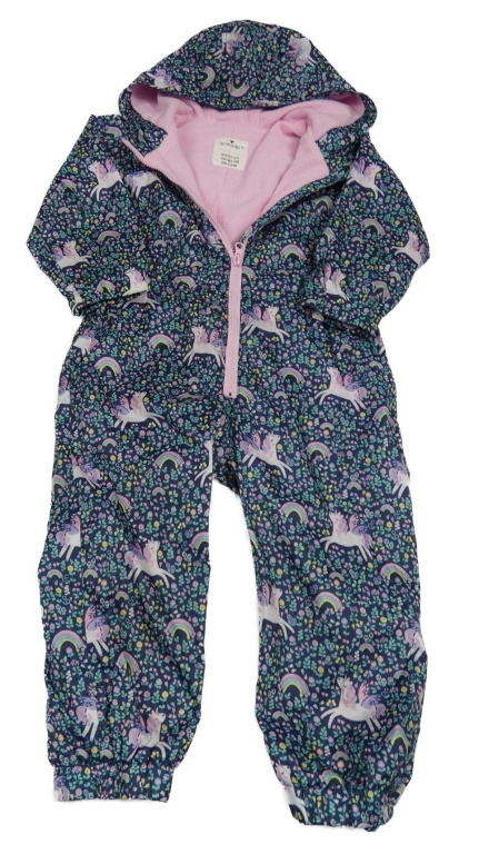 • Tmavomodro-ružovo-farebná kvetovaná šušťáková lehce zateplená kombinéza s jednorožcami a kapucňou Matalan