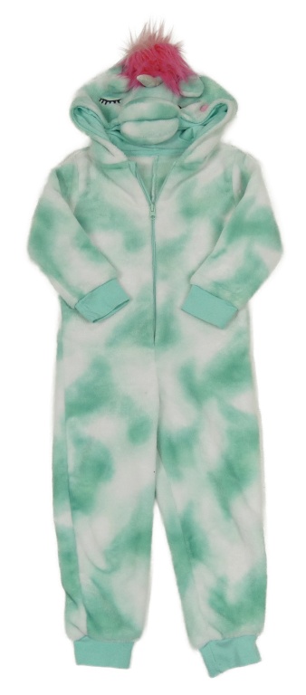Zeleno-biela vzorovaná plyšová kombinéza s kapucí - jednorožec
