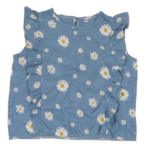 Modrá rifľová crop blúzka s kopretinami a volánikmi