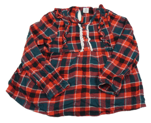 Červeno-čierno-biela kockovaná blúzka s čipkou a volánikmi