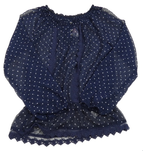 Tmavomodro-biela bodkovaná á žoržetová průsvitná blúzka s čipkovymi volániky C&A