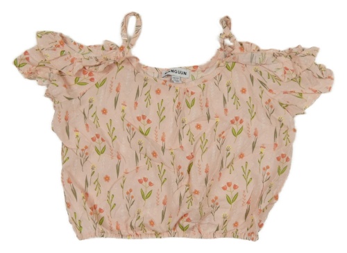 Svetloružová crop blúzka s kvietkami a volánikmi a volnými rameny MANGUUN