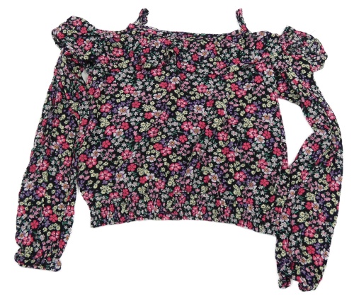 Čierna crop blúzka s kvietkami a volnými rameny a volánikom Page one young