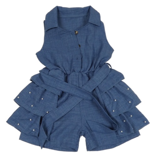 Modrý melírovaný kraťasový overal s perlami a opaskom