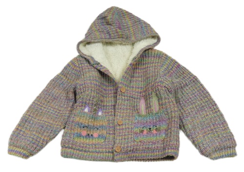 Fialovo-zeleno-okrový pruhovaný prepínaci zateplený sveter so zajícem a kapucňou Nutmeg
